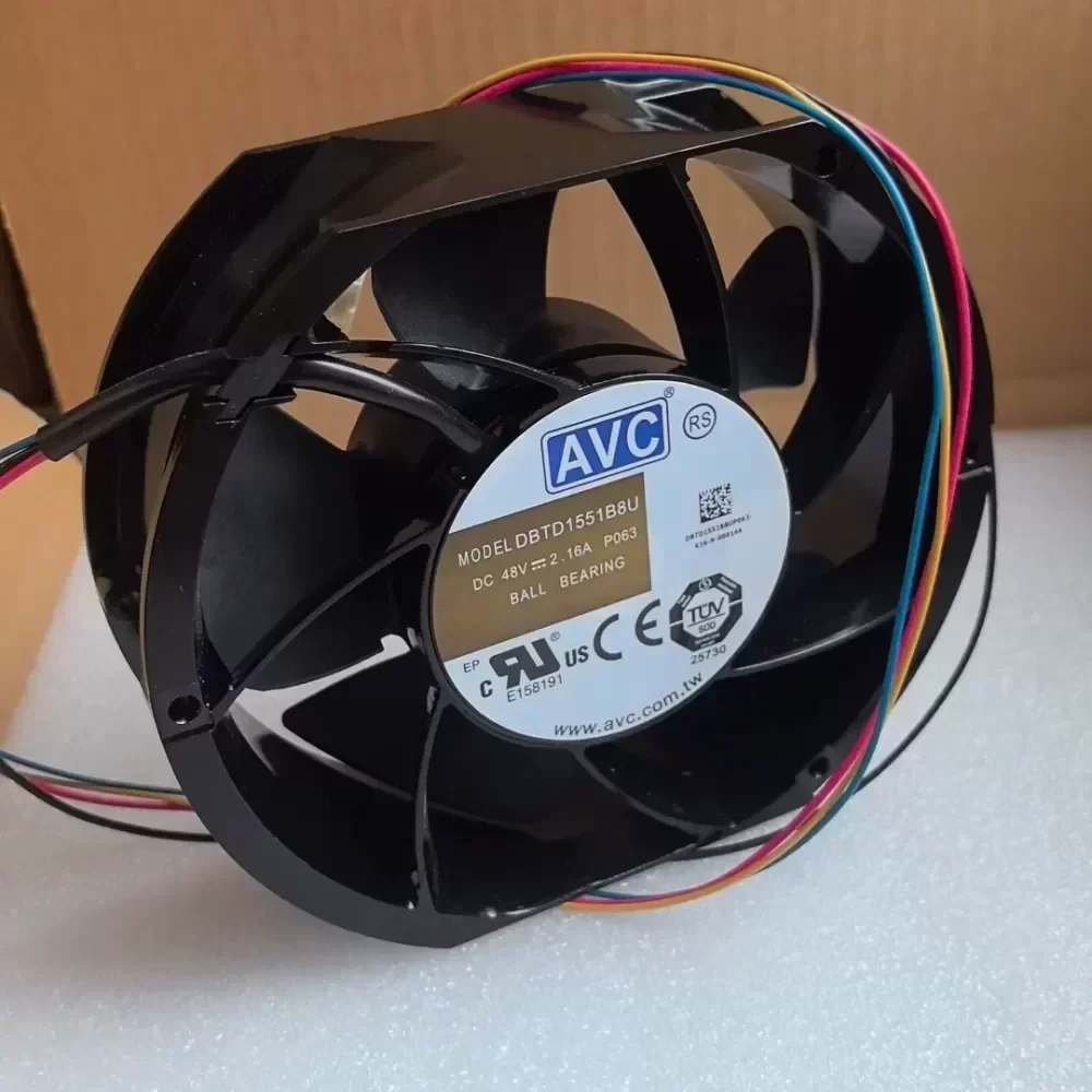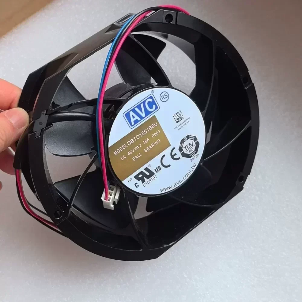 The AVC DBTD1551B8U is a high-performance industrial cooling fan engineered for demanding thermal management in high-density electronic environments. Operating at a nominal 48 VDC with a 2.16 A current draw, this unit is designed to deliver the high static pressure and significant airflow volumes required for critical infrastructure. The 172 x 150 x 51 mm form factor utilizes a dual ball bearing system, ensuring extended service life and mechanical stability during high-speed continuous operation.