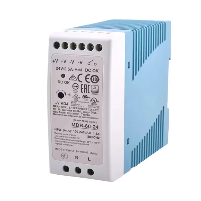 The MEAN WELL MDR-60-24 is a 60W Single Output Industrial DIN Rail Power Supply engineered for high-density installation in factory automation environments. This unit utilizes Original Engineering standards to deliver a regulated 24V DC output with a focus on minimizing no-load power consumption, making it suitable for energy-efficient control systems. The ultra-slim form factor allows for optimized utilization of rail space within crowded control cabinets, ensuring Technical Compatibility with standard TS-35/7.5 or TS-35/15 mounting rails. The device features a plastic housing designed to facilitate effective heat dissipation through free air convection, ensuring reliability without internal fans.