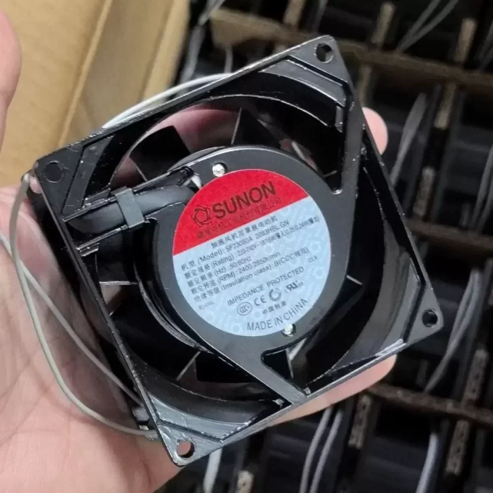 The SUNON SF23080A 2083HBL is a high-performance AC axial fan engineered for critical thermal management in industrial environments. Manufactured by Sunonwealth Electric Machine Industry, this unit features a robust aluminum alloy frame and a precision ball bearing system designed to sustain continuous operation under high thermal loads. The fan operates on a standard 220-240V AC input, providing consistent airflow to prevent thermal throttling in electronic enclosures and machinery. Its compact 80mm form factor allows for seamless integration into space-constrained chassis, ensuring Original Engineering standards are met for system longevity and reliability.