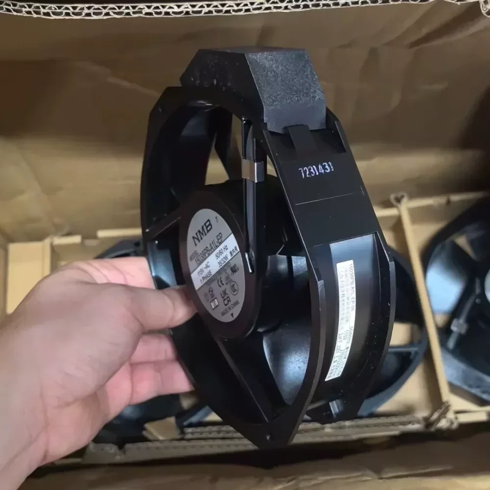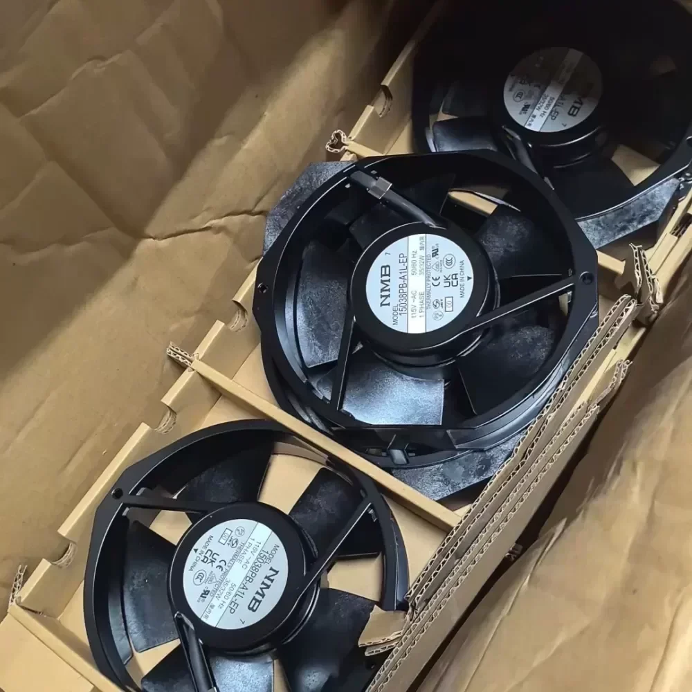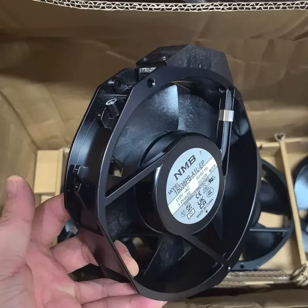 The NMB 15038PB-A1L-EP is a high-performance industrial AC axial fan engineered for consistent thermal management in heavy-duty electronic systems. Manufactured by NMB Technologies, this unit features a robust black die-cast aluminum frame designed to withstand rigorous operational environments while maintaining structural integrity. This model utilizes a precision dual ball bearing system to ensure smooth rotation and extended service life under continuous duty cycles.