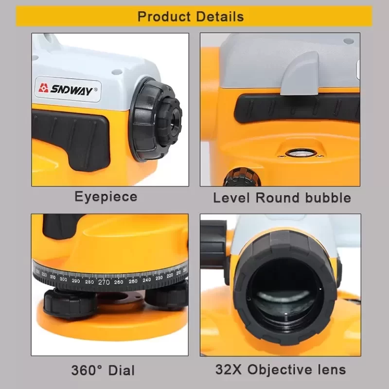 The SNDWAY SW-32A Optical Automatic Level is a high-precision surveying instrument engineered for rigorous outdoor construction and geodetic applications. This model features a 32X magnification optical system housed within a durable ABS casing, designed to withstand harsh field conditions while maintaining measurement integrity. The core mechanism utilizes a magnetic damping compensator, ensuring rapid line-of-sight stabilization even in environments with heavy machinery vibration. This Original Engineering design facilitates precise height transfer and angle measurement. The unit provides high-fidelity imaging with an erect image orientation, ensuring Technical Compatibility with standard surveying protocols and leveling staffs. Lead Time for project completion is optimized through the fast-settling compensator and clear optics, reducing setup and reading time on complex sites.
