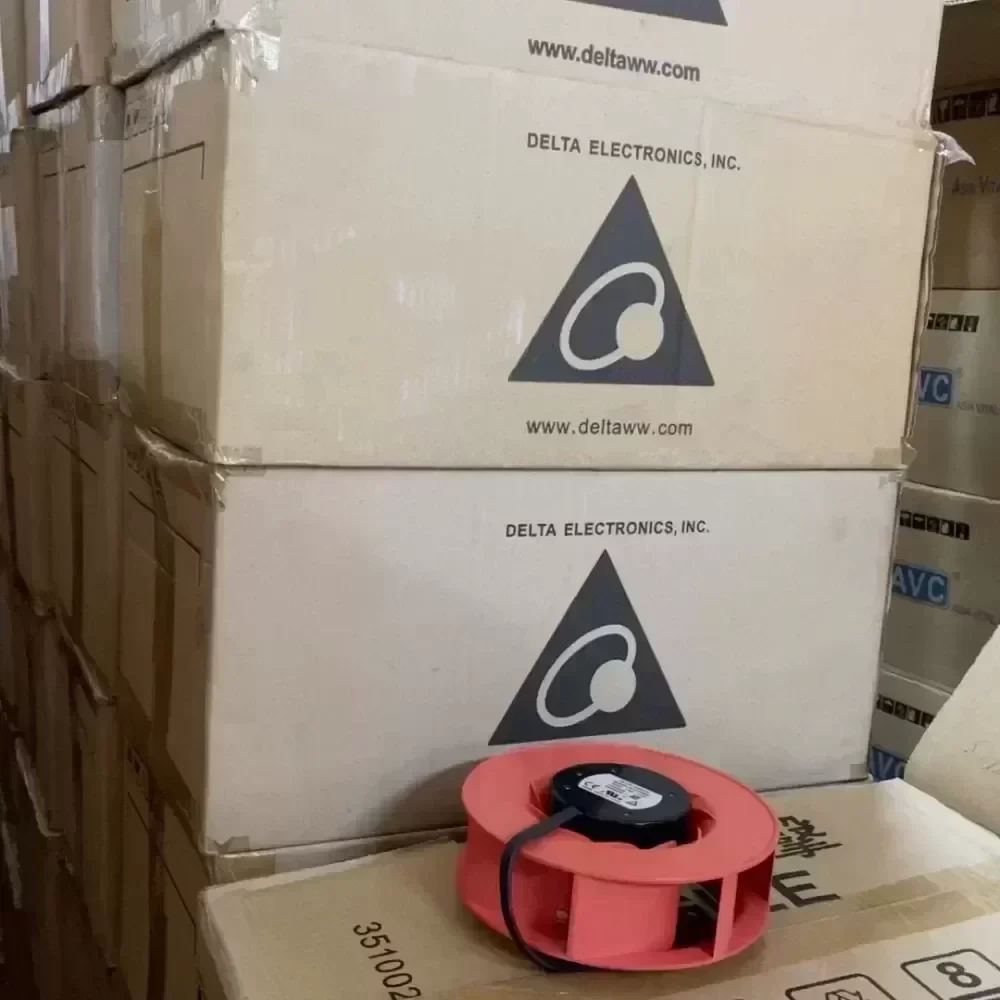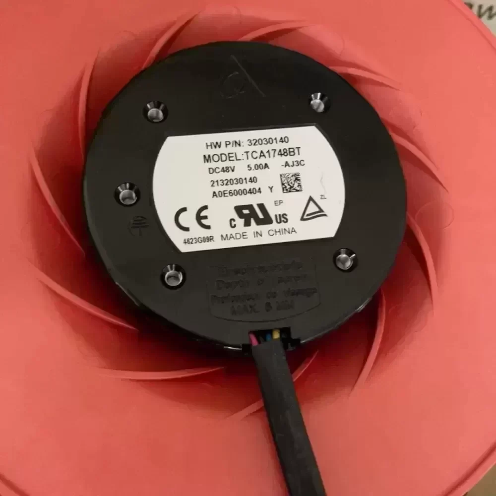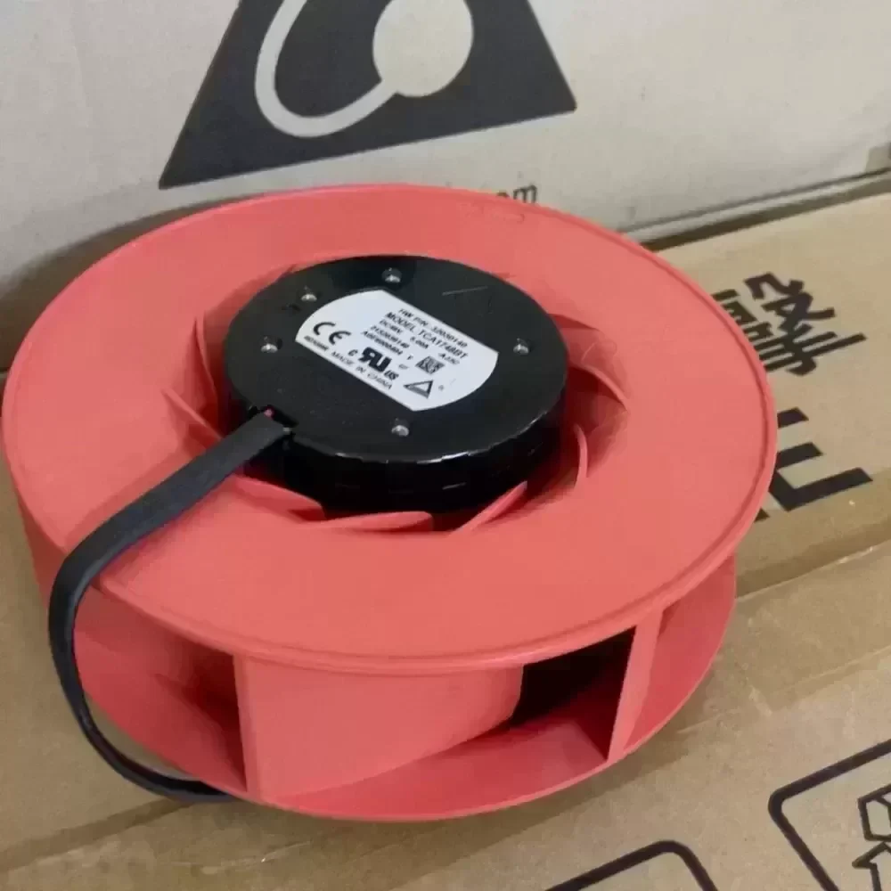 Brand new original Delta TCA1748BT turbo centrifugal fan, 48V 5.00A, size 175X69mm. Red housing, black motor, with cooling fin design.